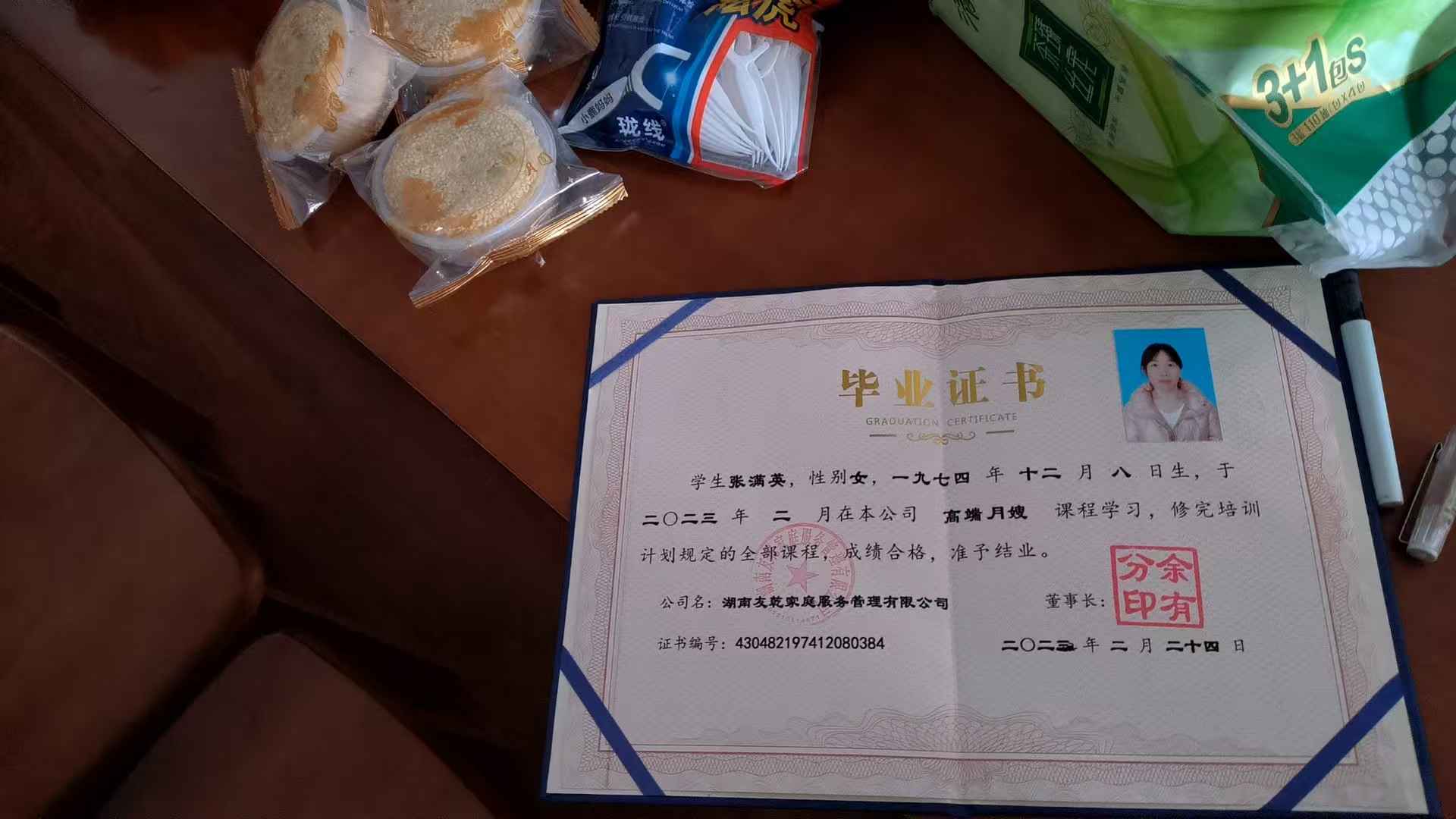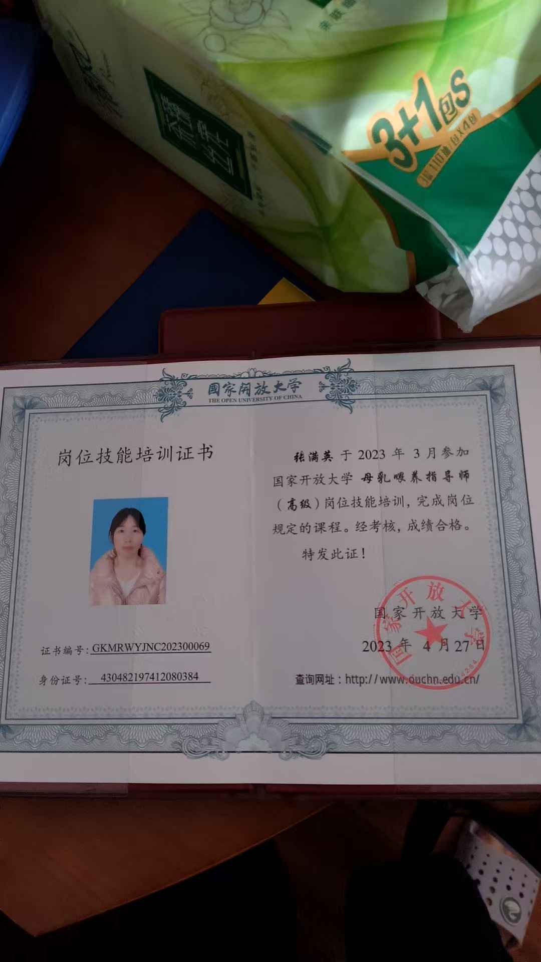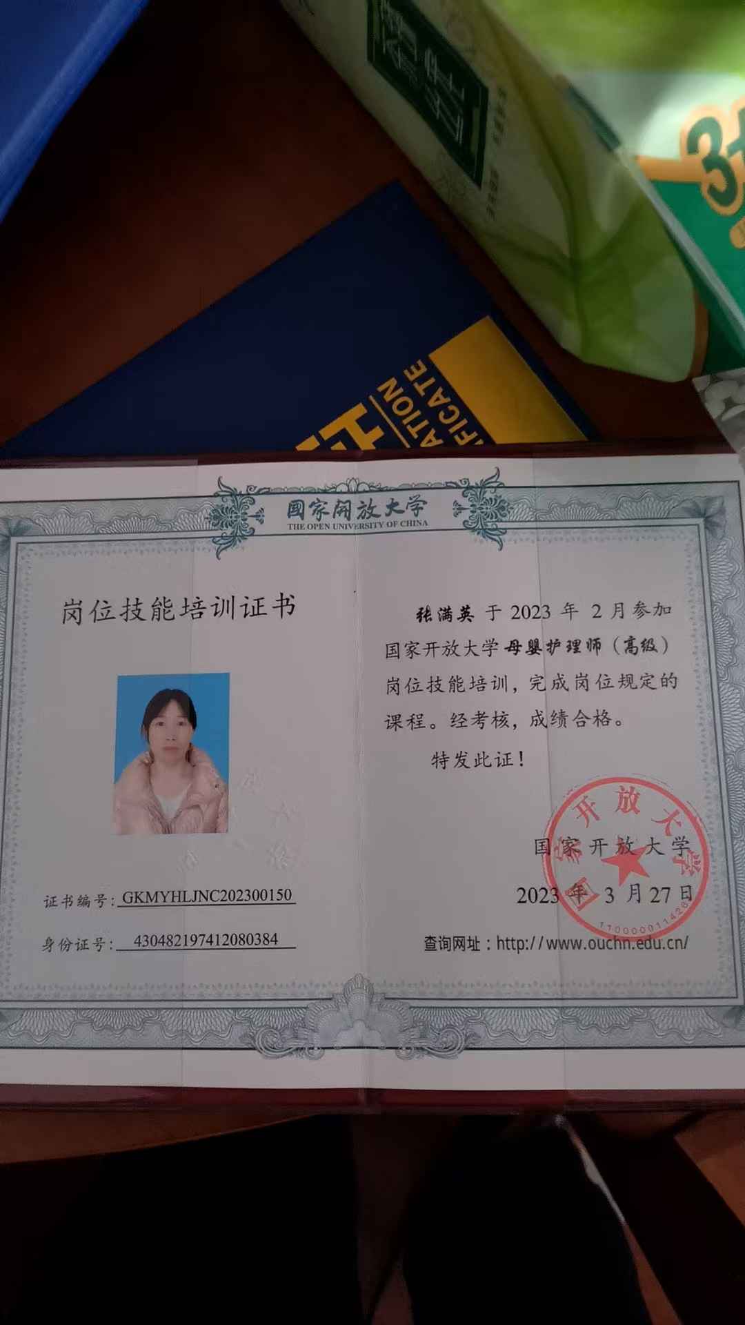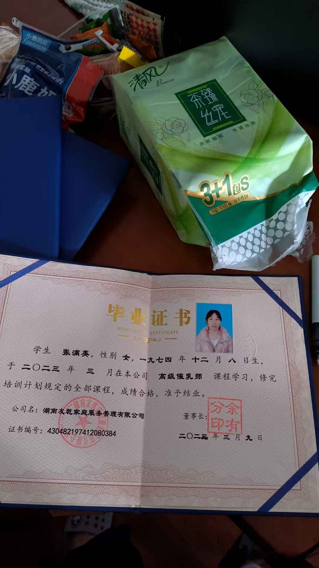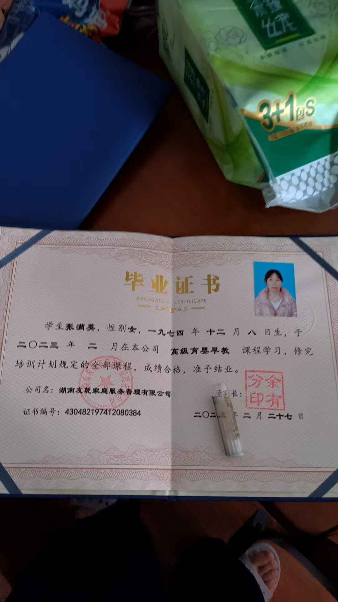 姓名,张满英 年龄,49岁 身高,157厘米 体重,45公斤 属相,龙 出生日期,1976120208 户籍,湖南省衡阳市常宁市松柏镇 初中学历,电话18807347581 家庭背景:一家四口,丈夫家乡务工,长子从事律所,次子市三甲在编医生。家庭成员清白,无任何不良记录。本人接单类型:月子,育婴师,早教,收纳,家政,护理,月嫂,催乳,短期月嫂。 培训经历,在长沙友乾参加高级月嫂,高级催乳,高级育婴师,早教,收纳,高级护理,月子餐,培训期间成绩优秀,获得职业资格证书。 工作经历,2O17年在衡阳市,香江花园带过刚满月的男宝宝。 2O18年在衡阳市碧桂园带过1岁半的女宝宝。 2O19年在衡阳市天水山城4月6日接育婴师3个月宝宝,2O2O年在东莞南城10月2日月嫂单,护理产后修复26天。 2O21年在东莞虎门2月8日月嫂26天。 2O21年长沙雨花区母婴护理。 2O22年7月份在长沙雨花区接月嫂单, 2O22年5月份广州天河区政府,接育婴师8个月宝宝,每天做辅食,爱劳动,干净。 2O23年4月9号梅溪湖壹号,接单,月嫂双胞胎。 2O23年6月1号望城区,接月嫂单。 2024年2月26号衡阳华新,接家政保姆单,2025年8月31号下户。 自我评价本人:以家庭为中心,以服务为宗旨,工作勤恳努力,工作认真负责,吃苦耐劳,有耐心,有爱心,特别喜欢宝宝互动。相信以我的专业知识,能很好地服务每一个家庭,让顾客满意。 客户评价,细心,耐心,热情,干净整洁,开朗。