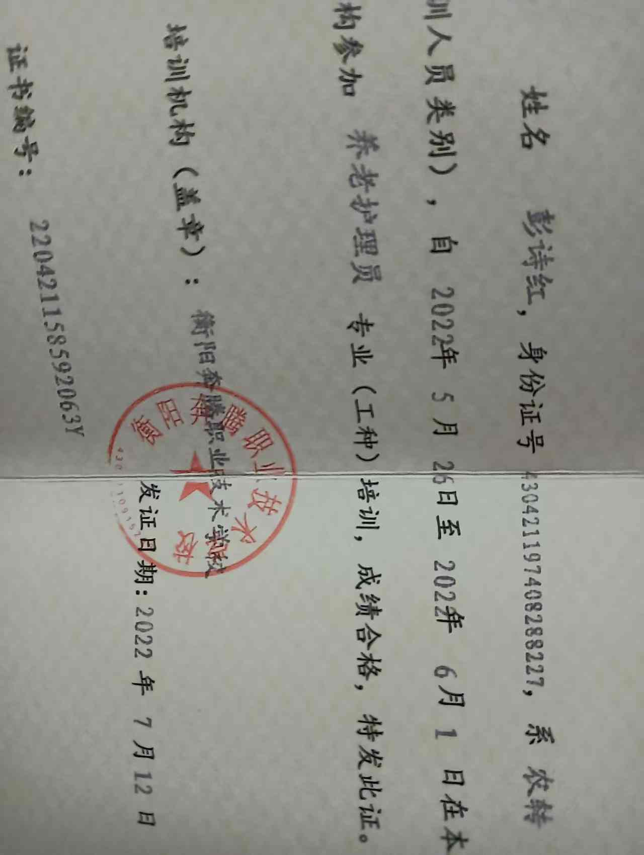 育儿嫂(可住家) 姓名 彭诗红 籍贯 :湘(衡阳) 年龄 : 52 学历 :初中 民族 :汉 工龄 : 5 身高 : 1.66 语言:普通话 家庭情况:丈夫,女儿,儿子 自我评价?:好 专业技能:带小孩,煮菜 擅长菜系:家常菜 擅长技能: 技能证书:暂时没有 工作经历:5年