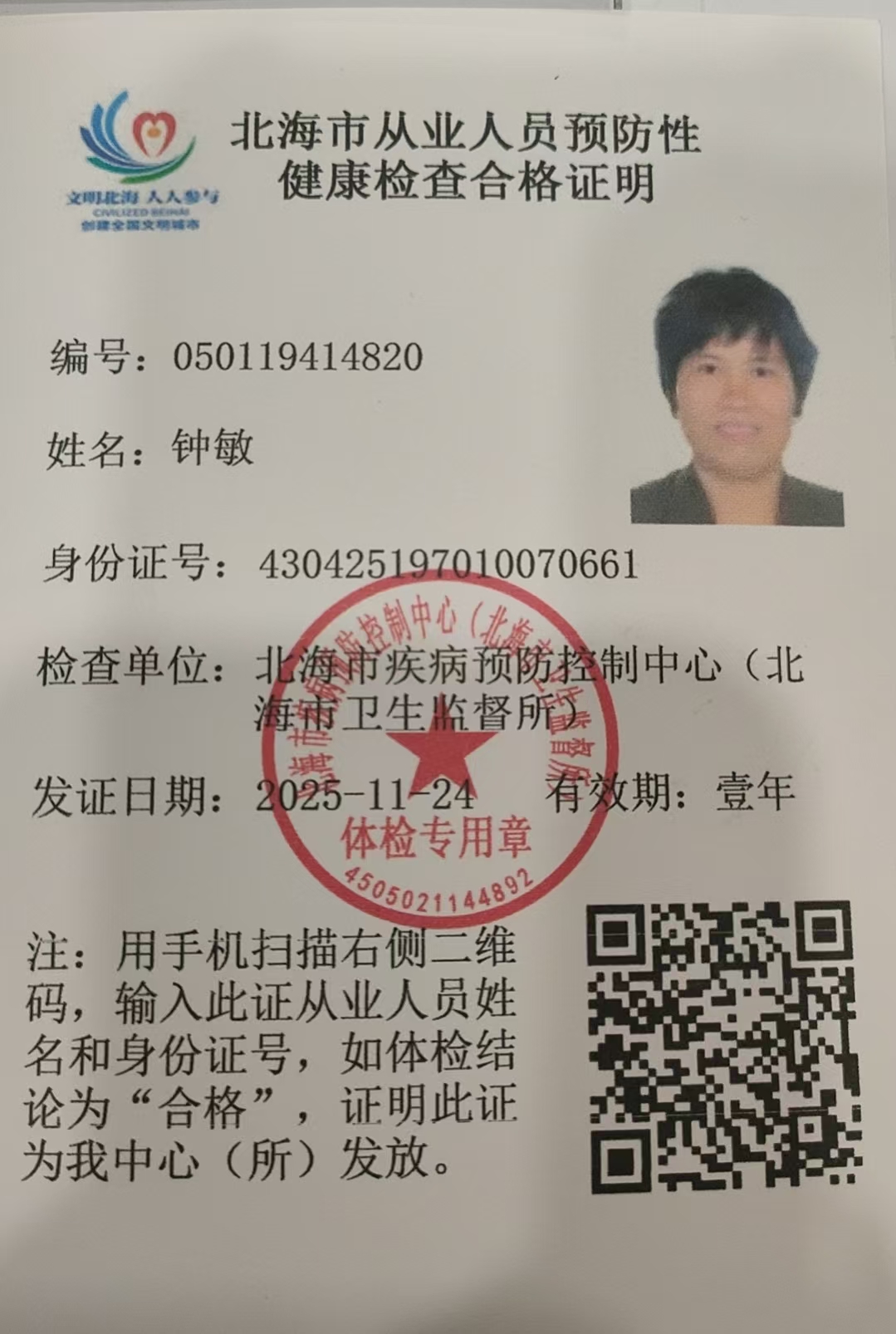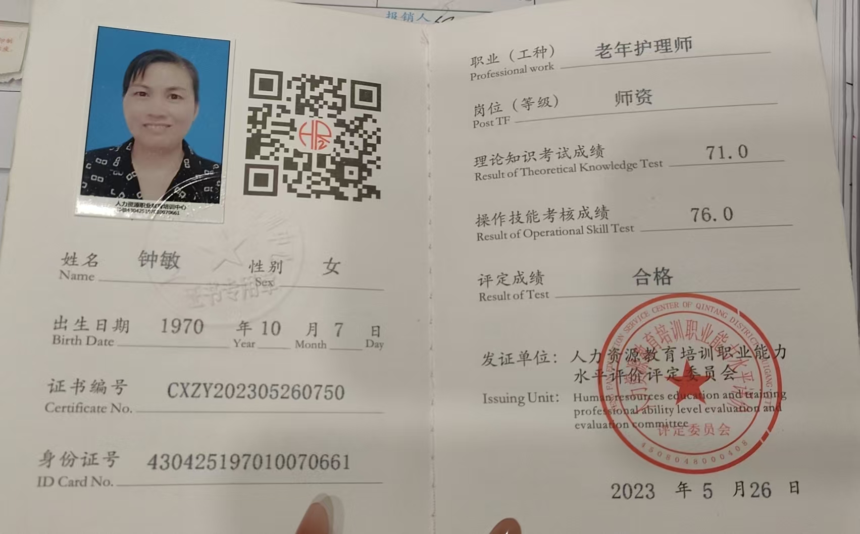 姓名:钟敏 籍贯:湖南衡阳 年龄:55 属相:狗 身高:165CM 体重:60KG 民族:汉 学历:大专 婚否:已婚 语言:普通话 证书:高级育婴师证,高级母婴师证,养老师资证 技能:会做各种湖南菜,香辣菜,清淡菜,清蒸鱼,辣椒炒牛肉,炒广东菜,煲广东汤,会量血压,测血糖,打胰岛素,老人的日常护理。做过经络养生,会专业按摩。 工作经历: 2020年至2022年一直在湖南衡阳钟婕露诊所做护理员。 2023年一2024年,在老家做过养老护理,在衡阳市养老院做过护理员。 2025年4月,在深圳尉蓝海岸照顾 不能自理老人 2025年10月至今在龙岗合正方州照顾 半自理男老人 自我评价:性格开朗,手脚勤快,爱干净,整理收纳,做饭好吃,干净卫生,眼里有活,服从安排。