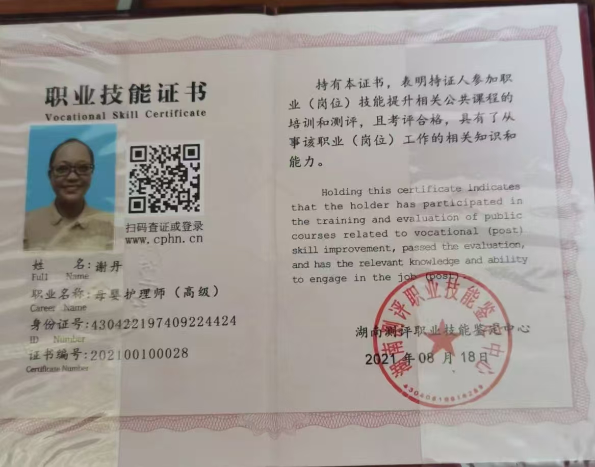 姓名:谢丹 性别:女 学历:高中 出生年月:1974 09 22 身高:158 家庭住址:衡阳碧桂园华新时代 婚姻状况:已婚 家庭成员: 毛诗文 (母女) 性格优点:性格温和,平易近人,爱干净,讲卫生,做事比较仔细,责任心强。 本人特长:本人从事母婴护理工作5年,有带小宝和带大宝的专业技术,特别是小月龄宝宝,懂早教,会辅食,对宝宝有引导方法,善长科学带娃,会做花样辅食。 技能和专业:宝宝的日常和常见疾病护理以及早期教育。 宝宝的日常:主要包含了宝宝的人工和混合喂养,培养规律睡眠,体温测量,洗澡,三操,拍嗝,奶瓶玩具消毒,辅食添加以及衣物清洗等日常。 早教方面:我会根据早教的五大领域(大动作训练,精细动作训练,认知能力训练,社会行为训练,语言训练)去开发孩子的大脑,让宝宝体能智能和心理素质都能得到全面的发展。认黑白卡,手指谣,唱歌,玩积木,读绘本,陪宝宝一起玩游戏等等,我会根据不同阶段的月龄,制定相应的工作流程和早教计划。本人性格:善良心细,实实在在、热情开朗,对人友好,善与人沟通,尊老爱幼,责任心强,喜欢小孩。 客户评价:非常有爱心,细心,责任心,做事有规律,真心对宝宝好,对宝妈照顾无微不至,感恩。