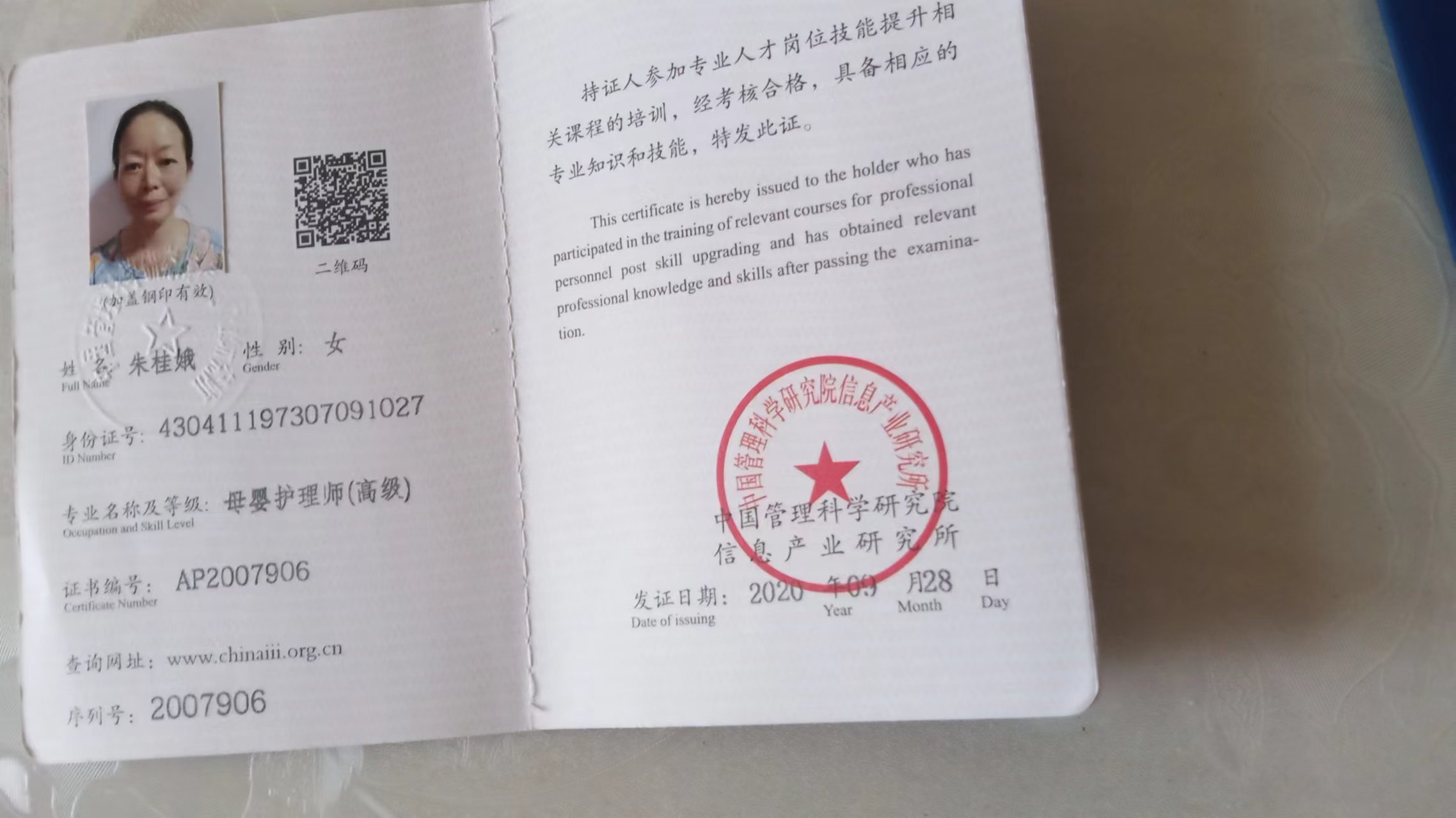 简历 姓名:朱桂娥, 性别:女, 年龄:52岁 籍贯:湖南衡阳, 民族:汉族, 身高:1米 53,体重 110 斤, 语言:普通话。 本人于 2020 年开始从事家政行业五年,带过10个小宝宝。考了月嫂+育婴师证:一直做育婴师单,对护理月龄宝宝经验丰富,会帮宝宝洗澡,游泳做抚触,做被动操,排气操,呛奶,湿疹(痱子、红屁屁的问题处理经验较强),做菜口味好,蒸菜,汤,炒菜都好吃,宝宝辅食多样化。本人性格温柔有耐心,希望通过我的服务,让小宝宝健康成长。