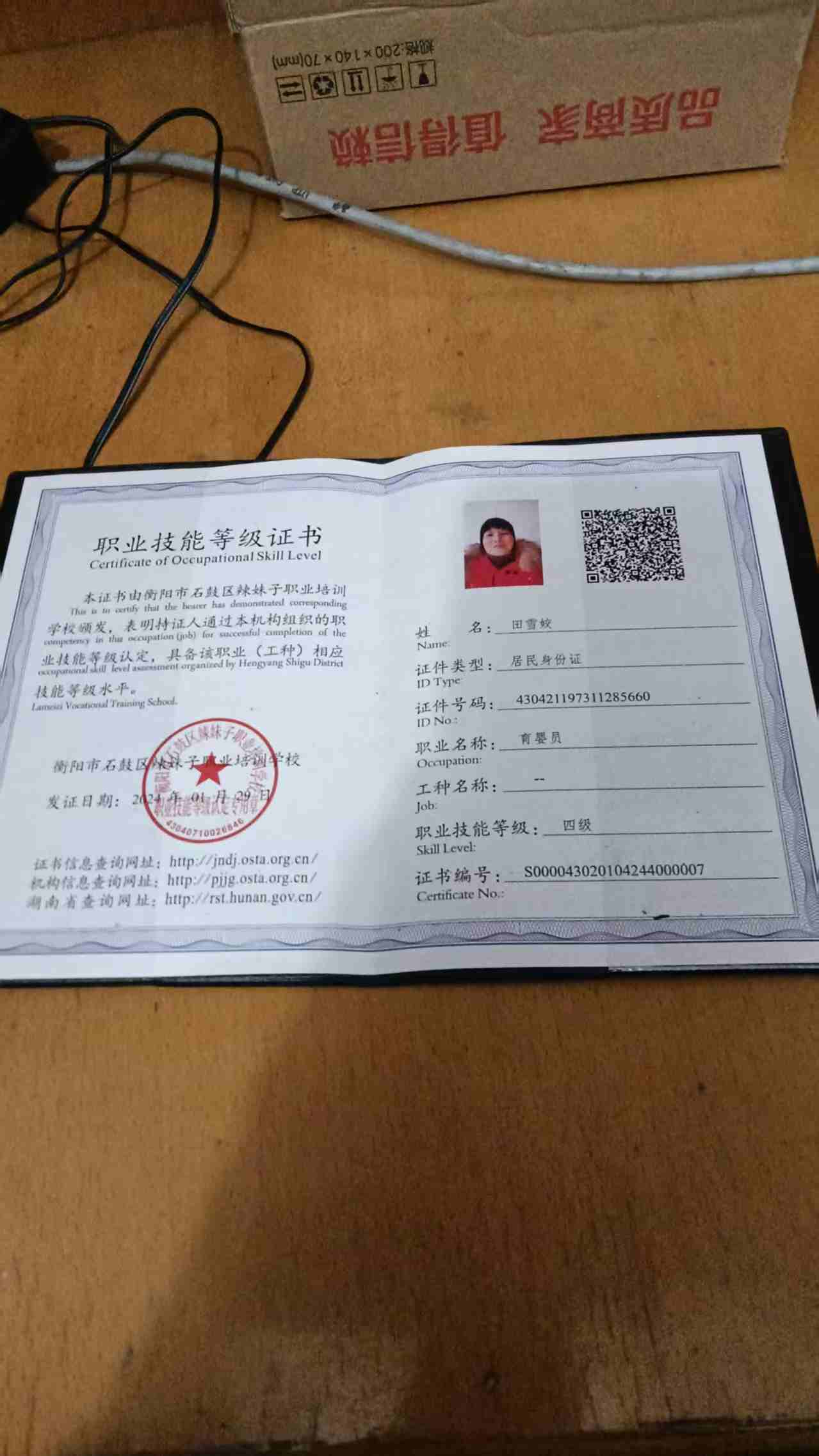 姓名:田雪姣 年龄:1973年 身高:1.58 姓别:女 体重:120 学历:初中 地址:衡阳市衡阳县金兰镇 家庭情况:老公电焊工,女:广州教书,儿:在广西读研究生 工作经历:做家政8年,带小孩,护理老年人,以前在工厂煮个60多个人的饭菜,勤快讲究,有耐心。性格好,好相处。 2013年在华新检察院带二个月女婴 2014年在白沙洲一纺机,照顾俩个老年人 2016年在蒸湘世纪城照顾俩个老年人直到百年 2024年在金果路照顾俩个老年人,现已离职