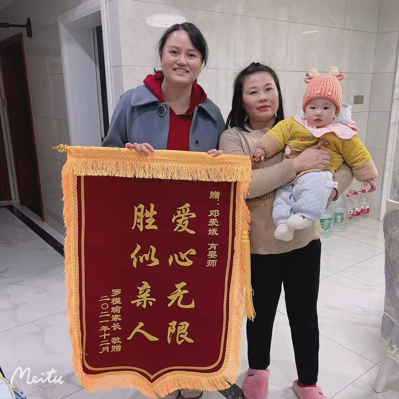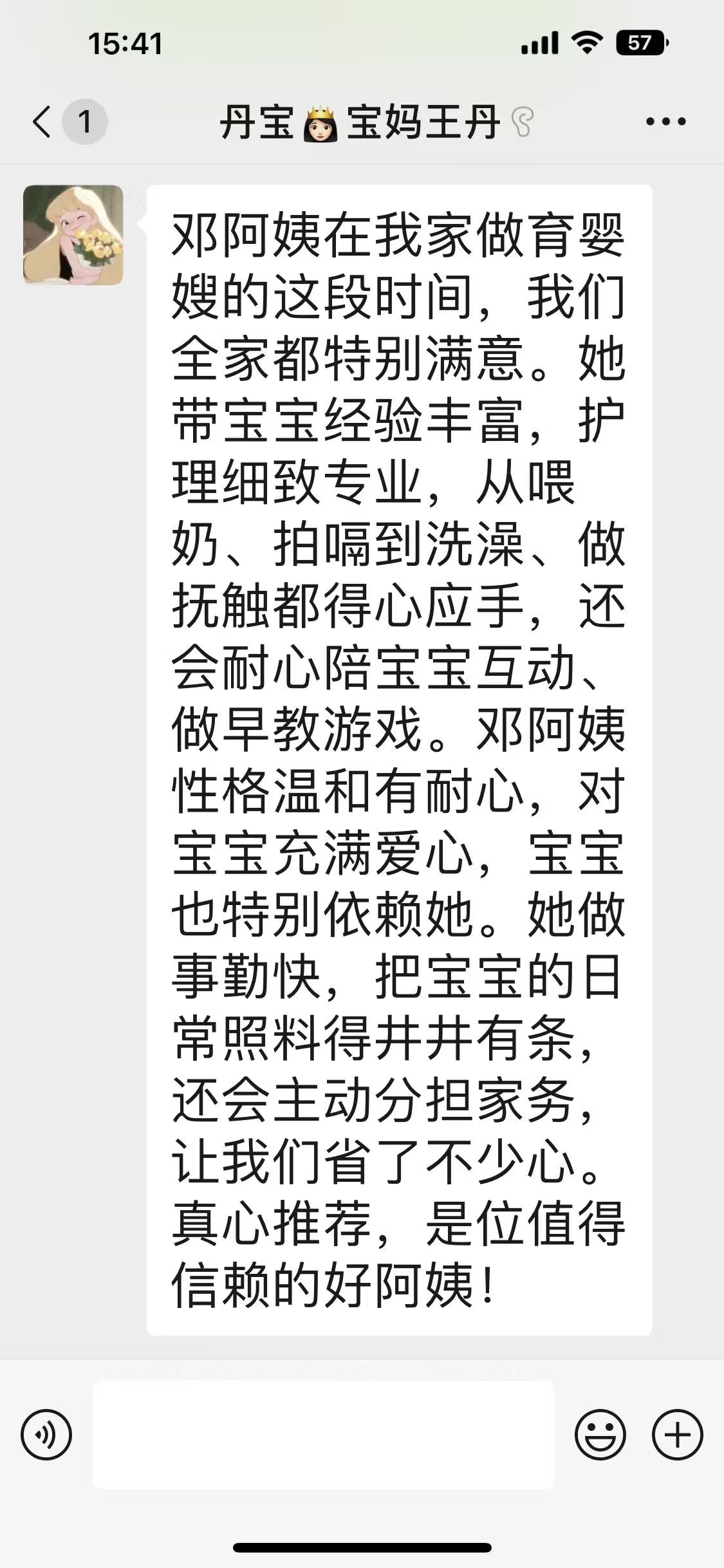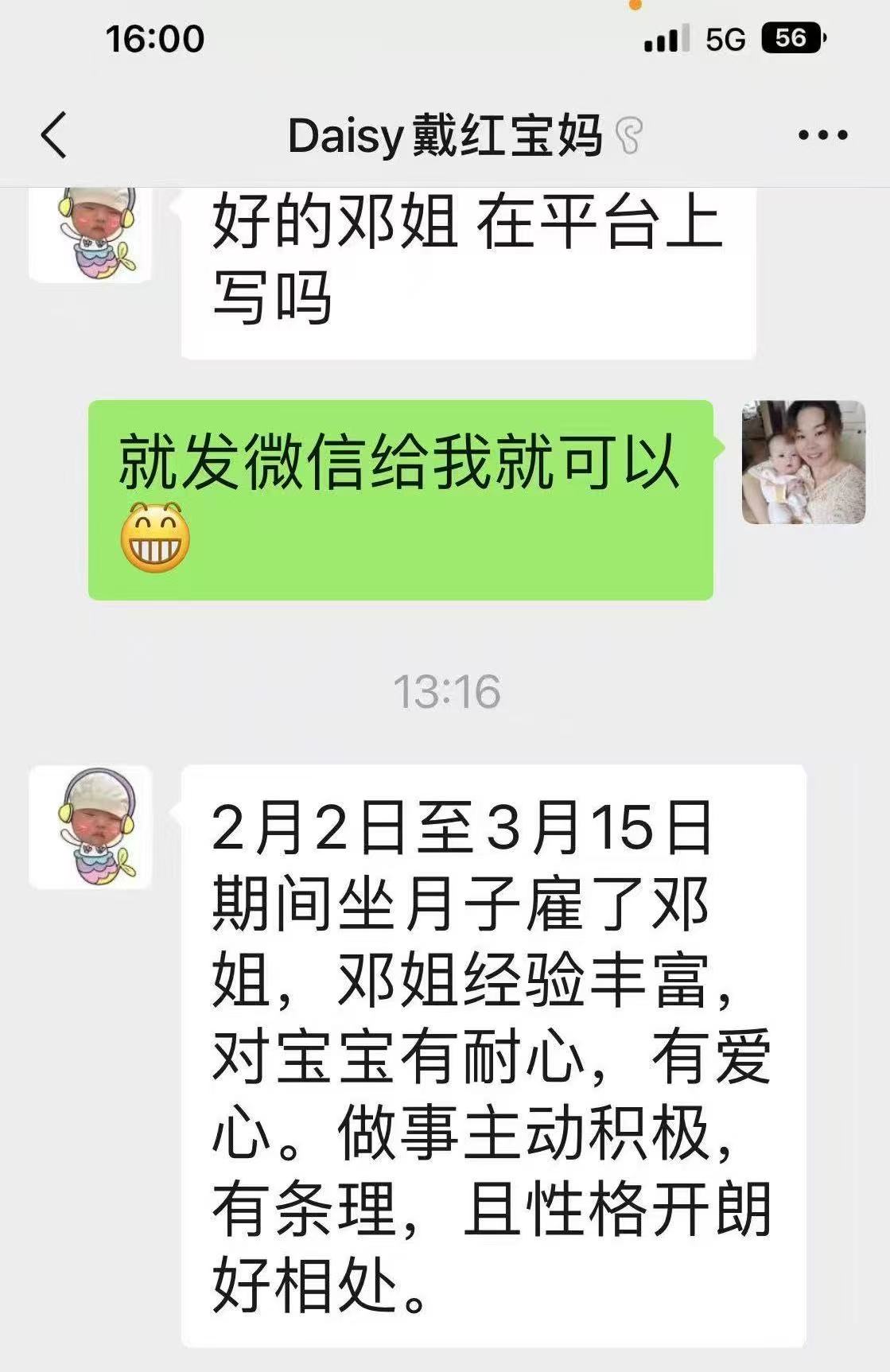 2、邓姐是位好学、耐心、有责任感的月嫂,善于总结,有上进心、属于月嫂中的精英,值得信赖。我们都很满意这位月嫂的工作表现,宝宝爸爸也学到很多照顾孩子的知识,减轻了我的负担。